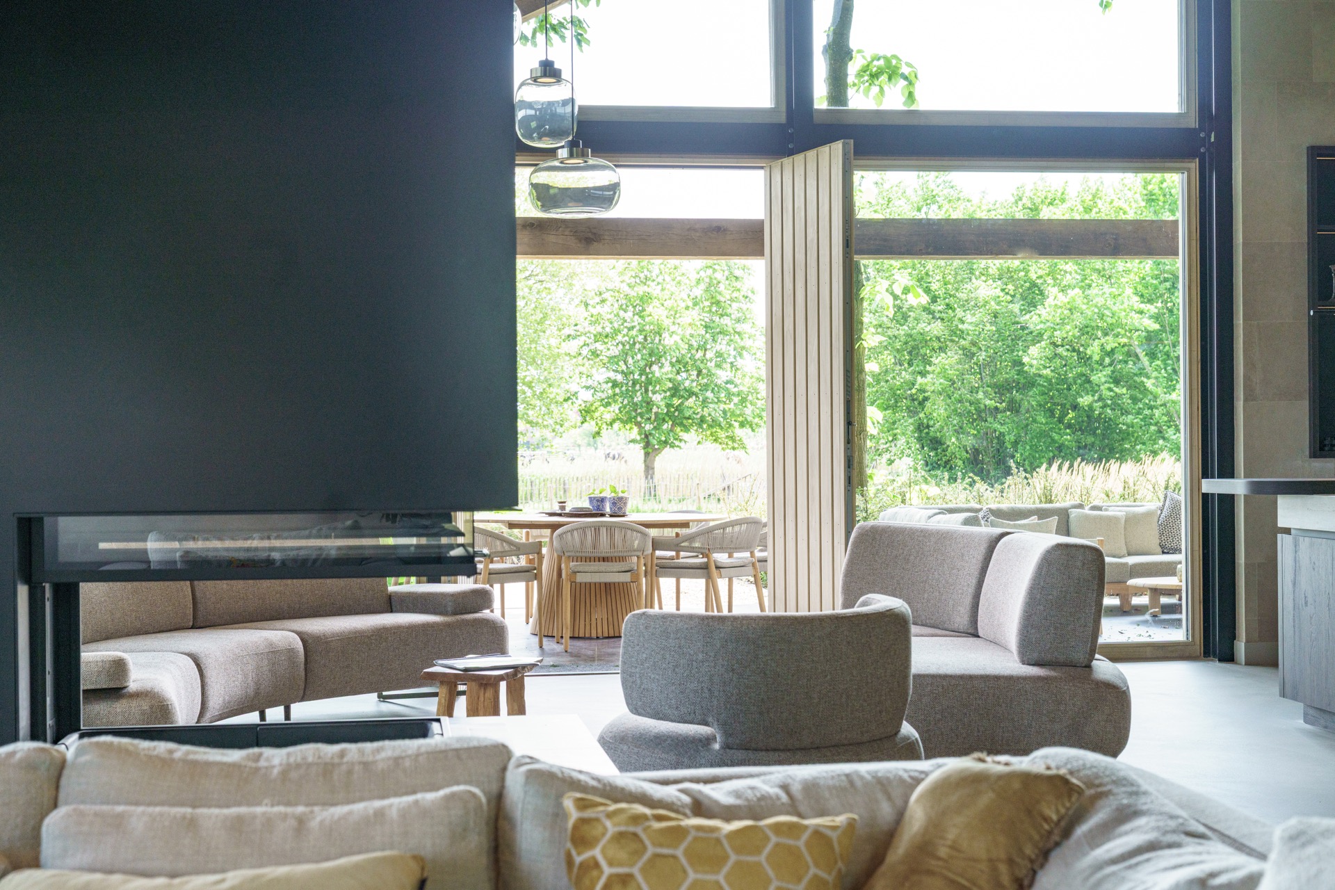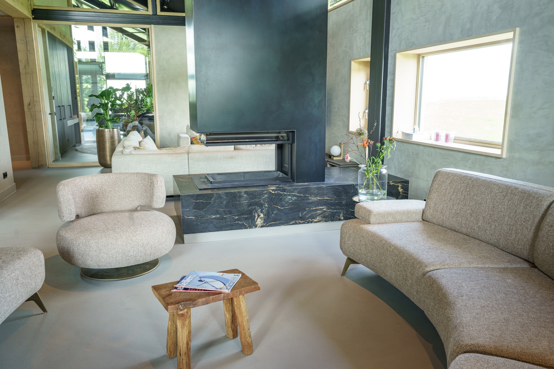 In het hart van deze monumentale boerderij brengt een haard in diep blauwstaal moderne elegantie samen met authentieke charme.