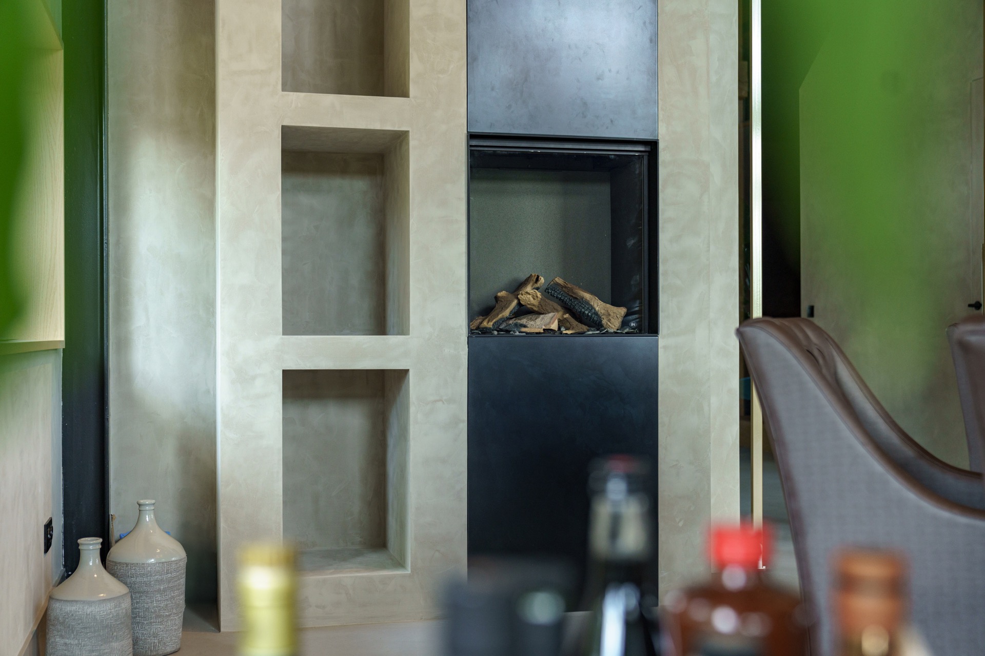 De sobere vorm versterkt de kracht van het materiaal: robuust, rauw en verfijnd gepatineerd. Afgewerkt door Grezzo, in harmonie met natuursteen en de karakteristieke lijnen van de ruimte. Ambacht en esthetiek, verenigd in vuur.