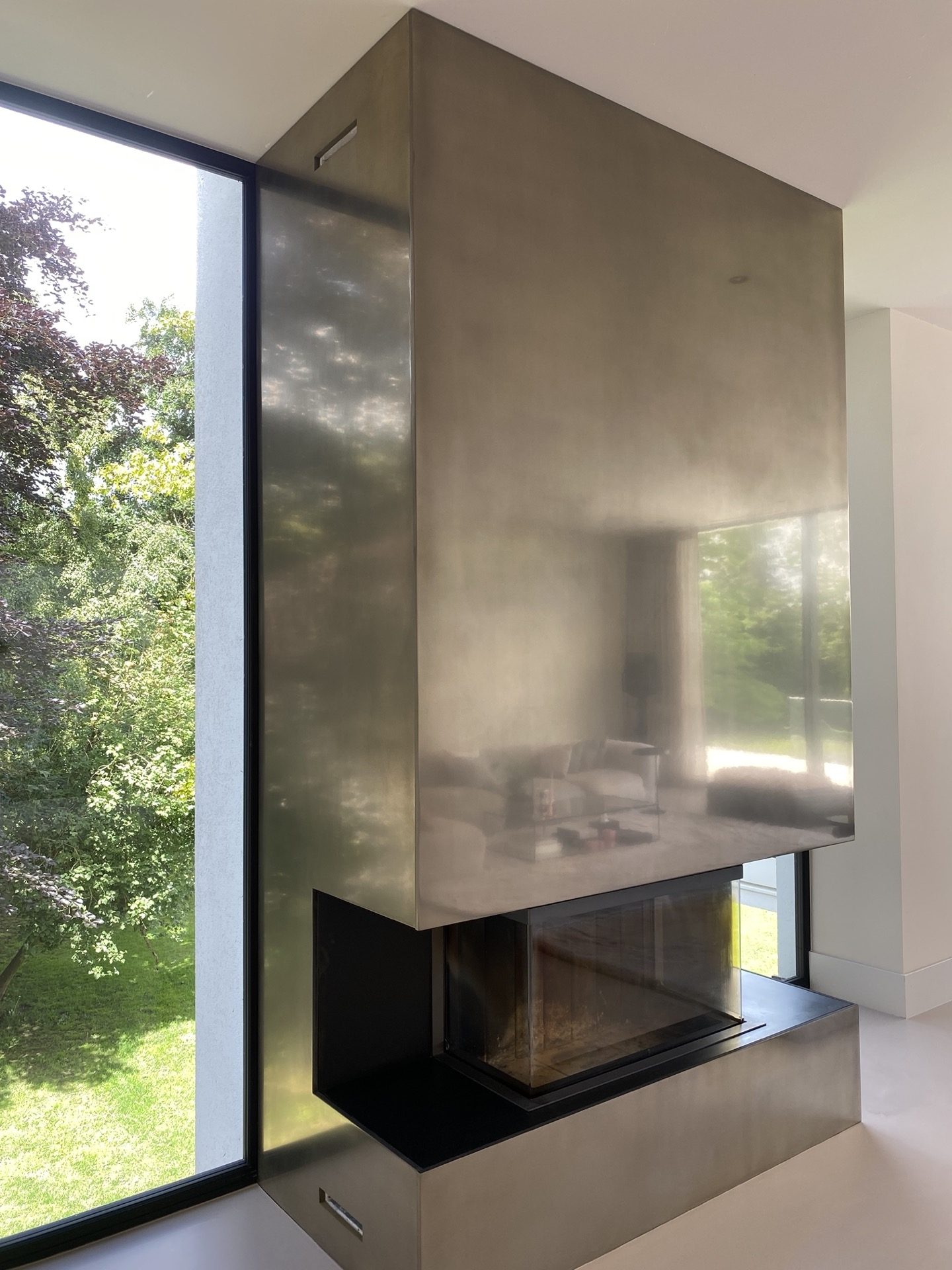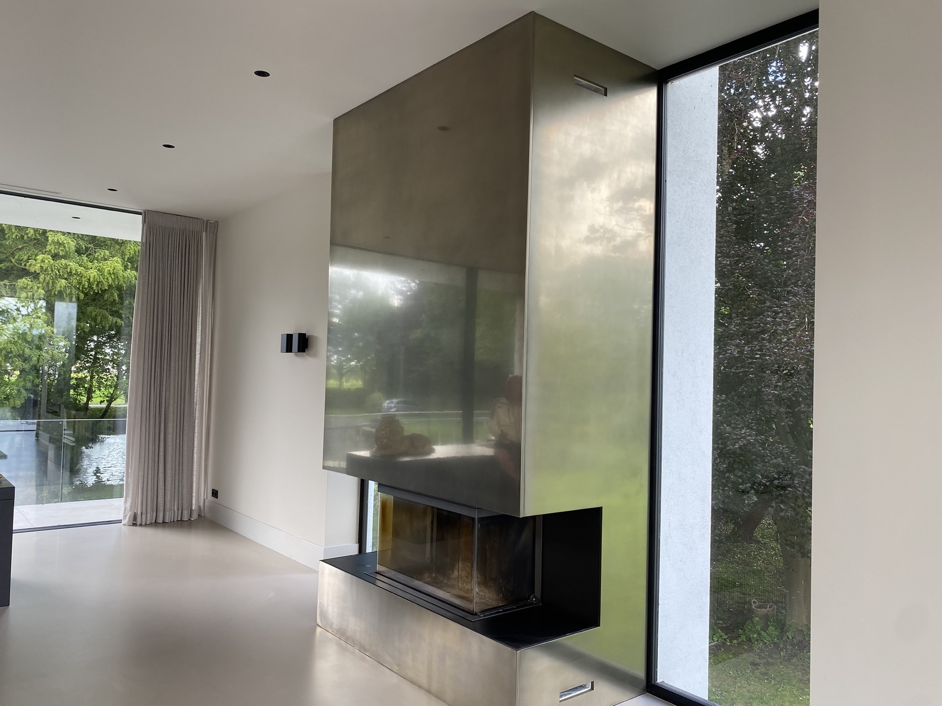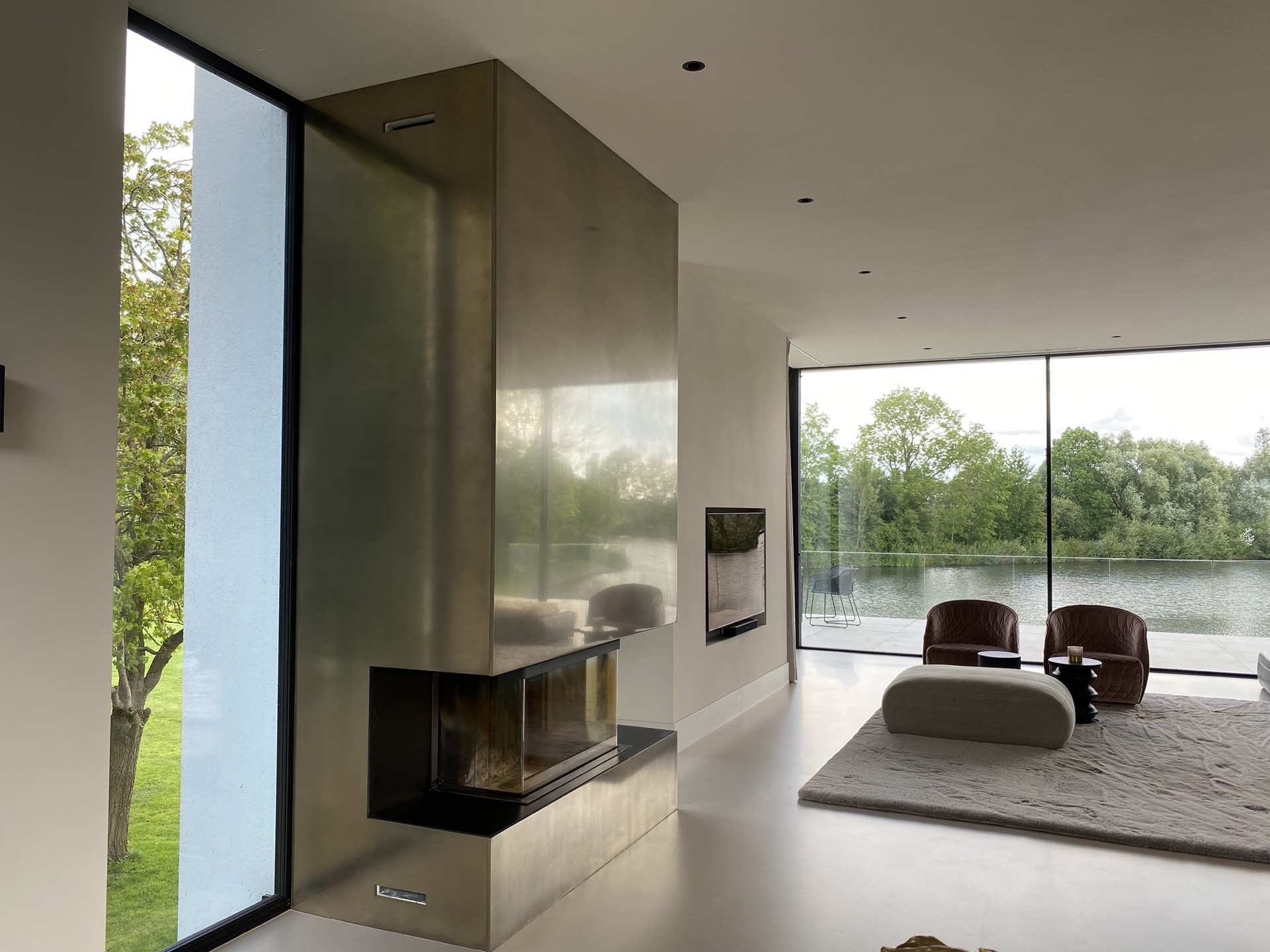 In deze moderne villa vormt de haard een sculpturaal statement. Afgewerkt in gepolijst Grezzo Metal ‘Witgoud’, weerkaatst het metaal op subtiele wijze het omgevingslicht en versterkt het de serene luxe van het interieur. Minimalistisch in vorm, krachtig in uitstraling — met de hand opgebouwd, tot in detail verfijnd.