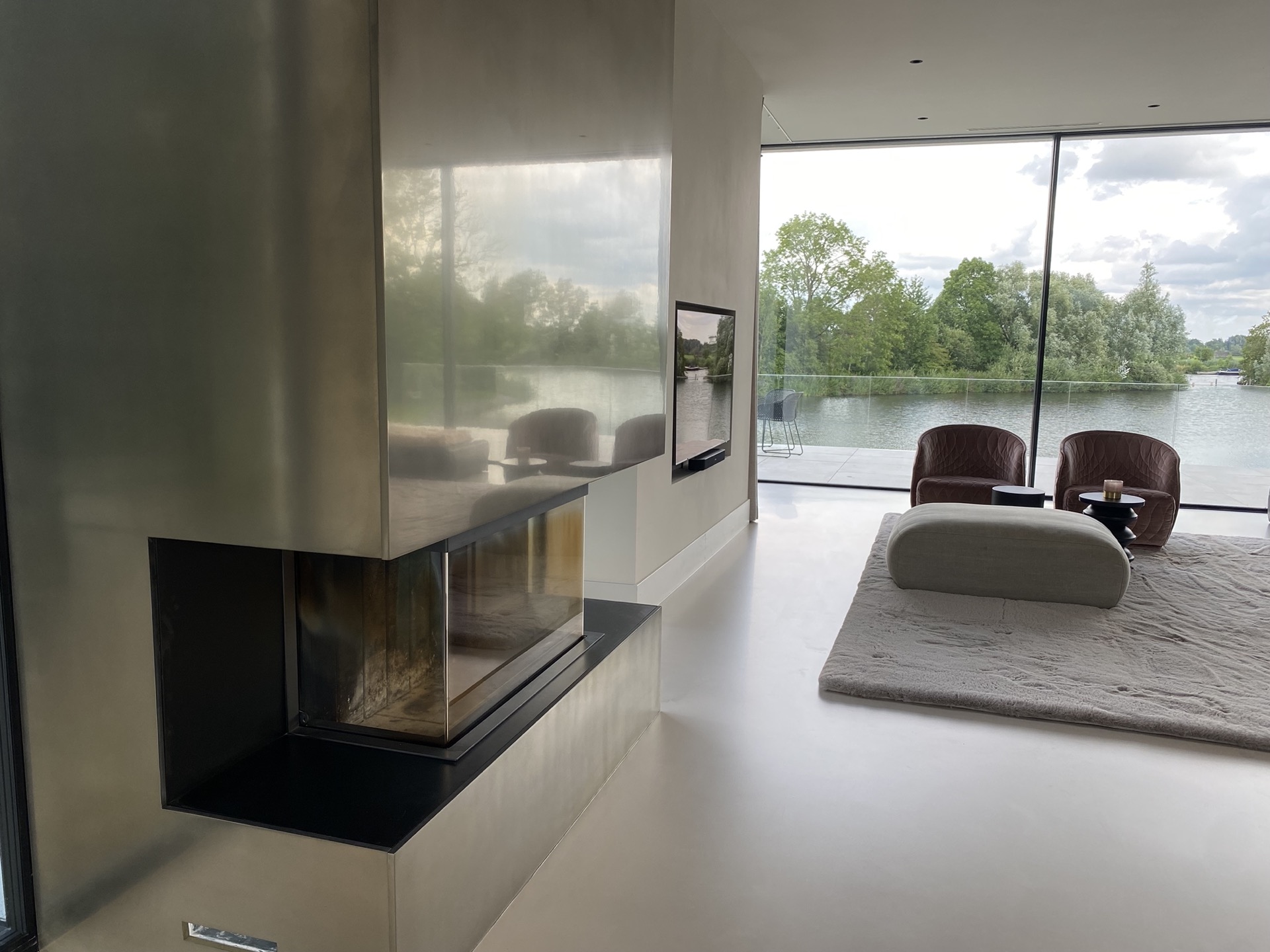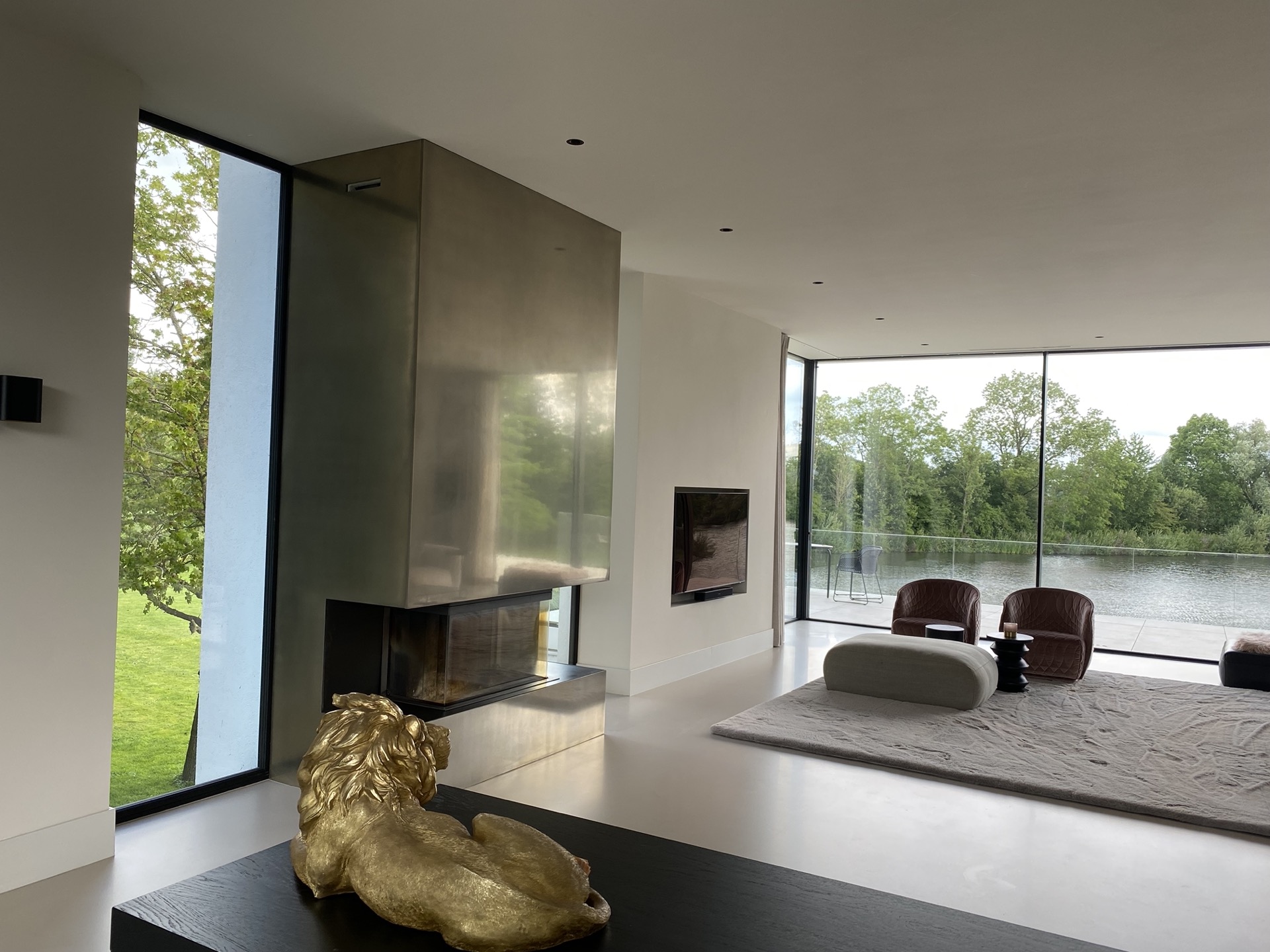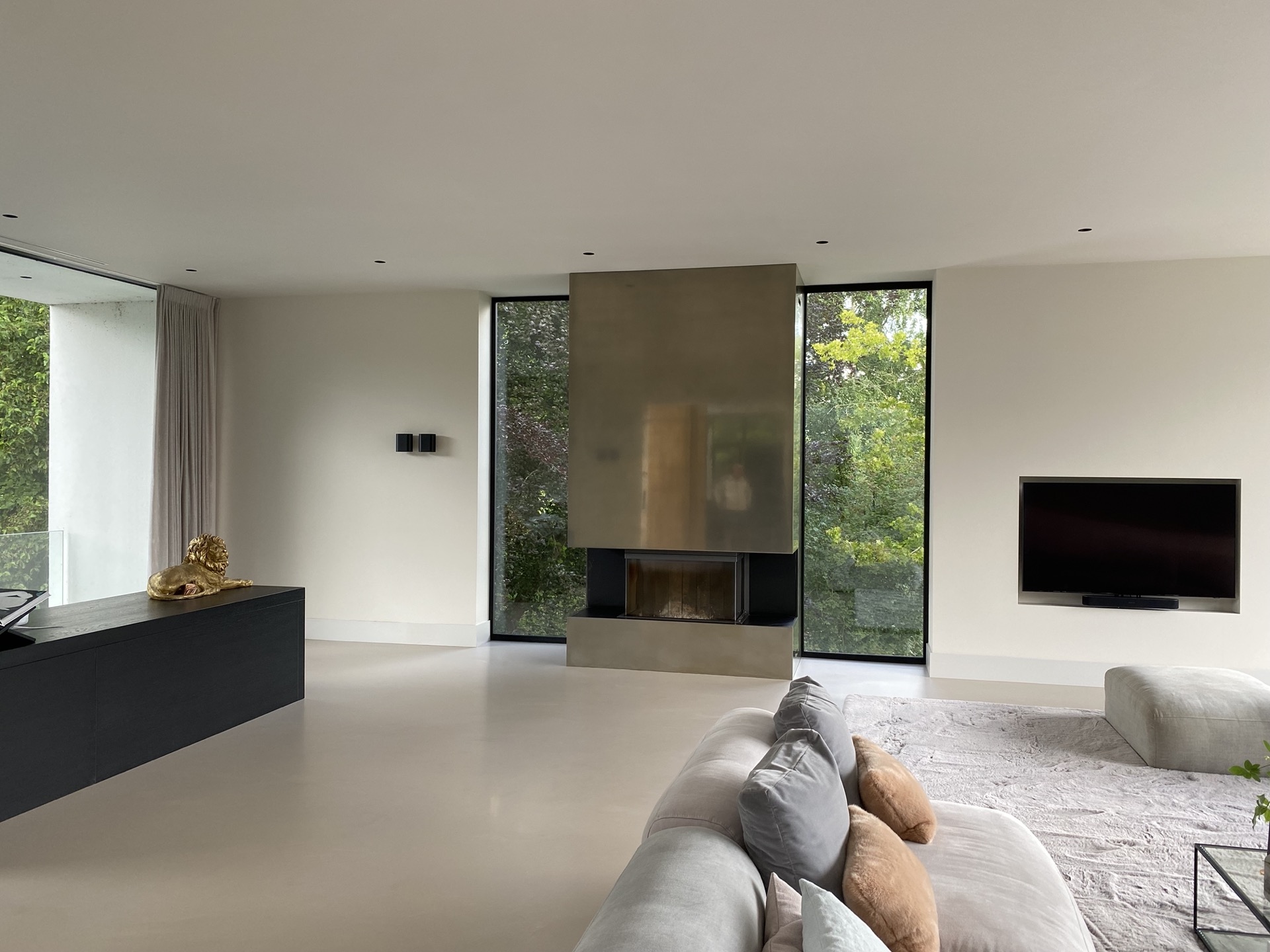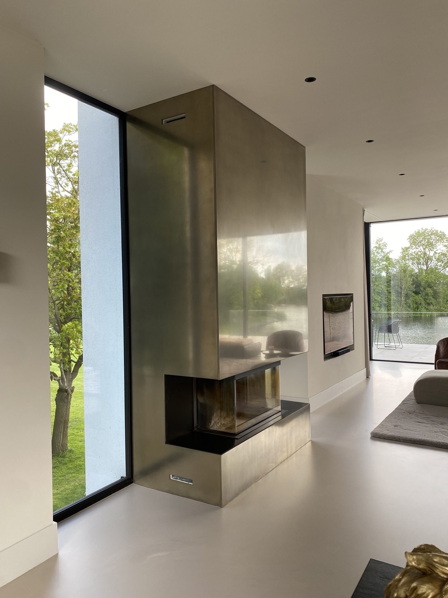 In deze moderne villa vormt de haard een sculpturaal statement. Afgewerkt in gepolijst Grezzo Metal ‘Witgoud’, weerkaatst het metaal op subtiele wijze het omgevingslicht en versterkt het de serene luxe van het interieur. Minimalistisch in vorm, krachtig in uitstraling — met de hand opgebouwd, tot in detail verfijnd.